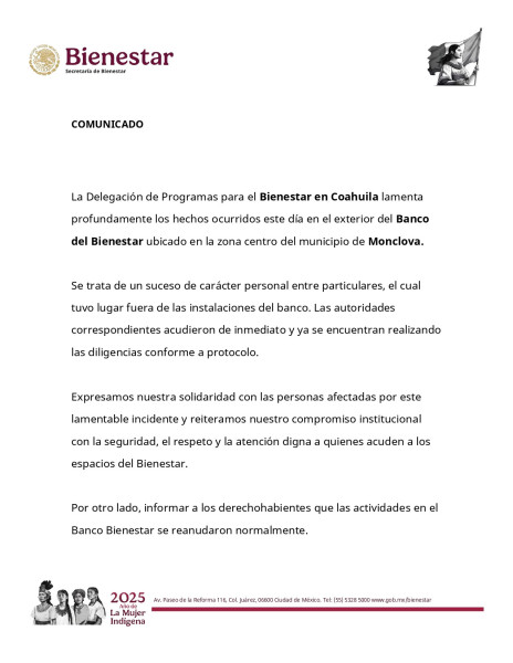 La Delegación de Programas para el Bienestar en Coahuila lamentó los hechos y precisó que se trató de un asunto personal entre particulares ocurrido fuera de las instalaciones del banco. Las actividades en la sucursal continuaron con normalidad, mientras las autoridades llevan a cabo las diligencias correspondientes.