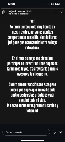 En una historia de Instagram, Sanz lamentó que el vínculo entre ambos haya terminado de esa manera y explicó que la ruptura se dio recientemente, tras rechazar una propuesta de inversión que Ivet le hizo en mayo.