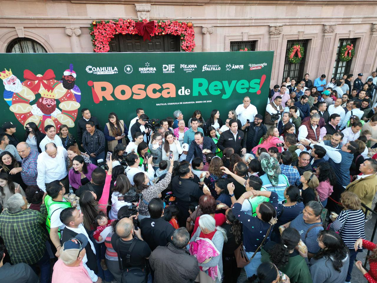 Saltillo, Coahuila de Zaragoza; a 06 de enero de 2026.- Desde la capital del Estado, el gobernador Manolo Jiménez Salinas, junto a su esposa Paola Rodríguez López, presidenta honoraria de Inspira Coahuila, partieron y repartieron entre miles de coahuilenses la tradicional Rosca de Reyes, evento con el que finalizan las actividades de Villamagia en todo el estado, y a donde acudieron esta temporada más de un millón de visitantes en todas sus sedes.