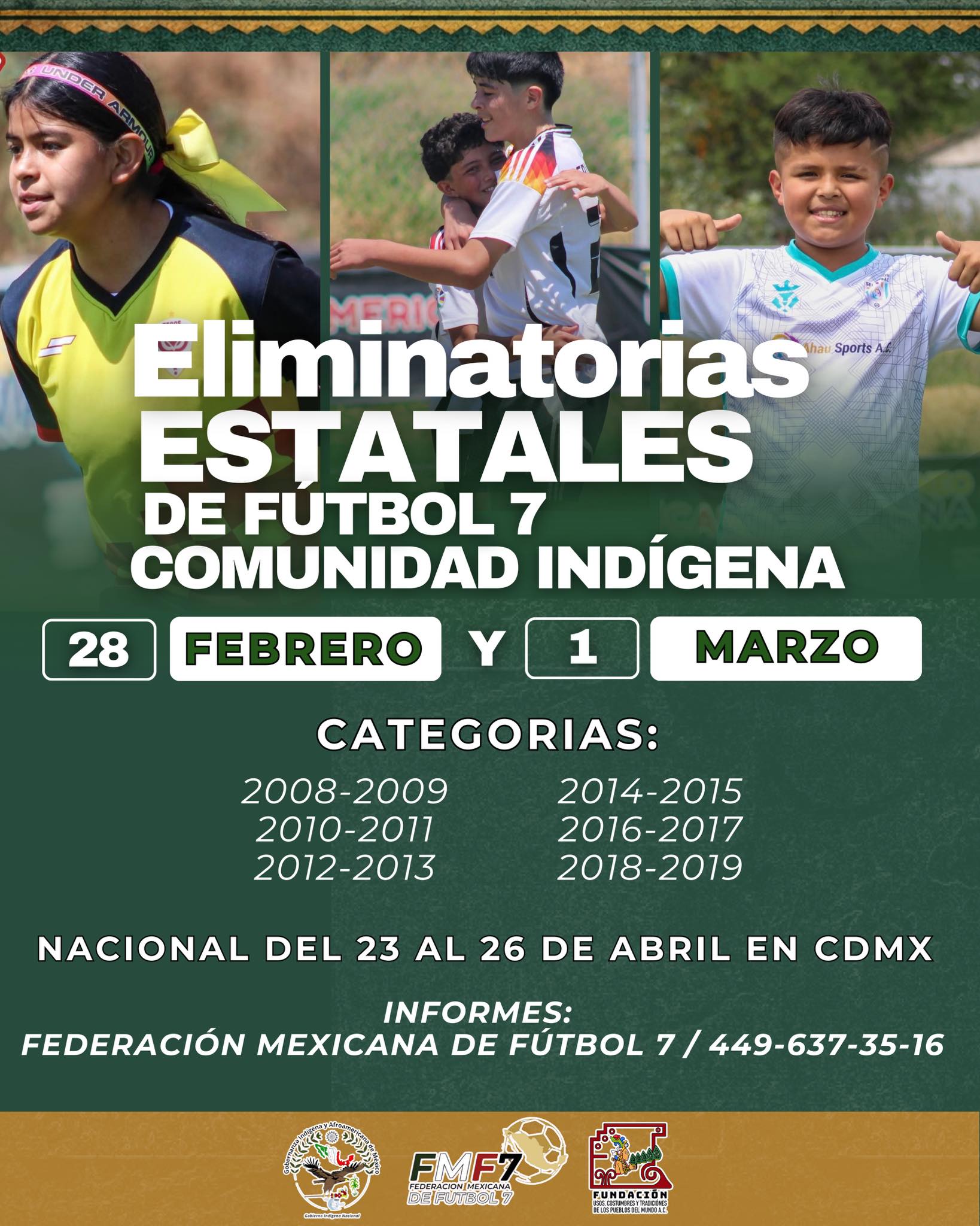 El camino hacia la gloria nacional del Fútbol 7 en México está por comenzar y, bajo la organización de la FMF7 y la Comunidad Indígena, se llevarán a cabo las eliminatorias estatales en diversos puntos de la República Mexicana este próximo 28 de febrero y 1 de marzo.